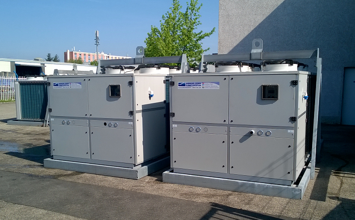 Chaque groupe frigorifique contient un échangeur de chaleur, un condenseur, un compresseur et des pompes de circulation. Ils ne nécessitent pas d’une alimentation permanente d’eau pour leur fonctionnement.