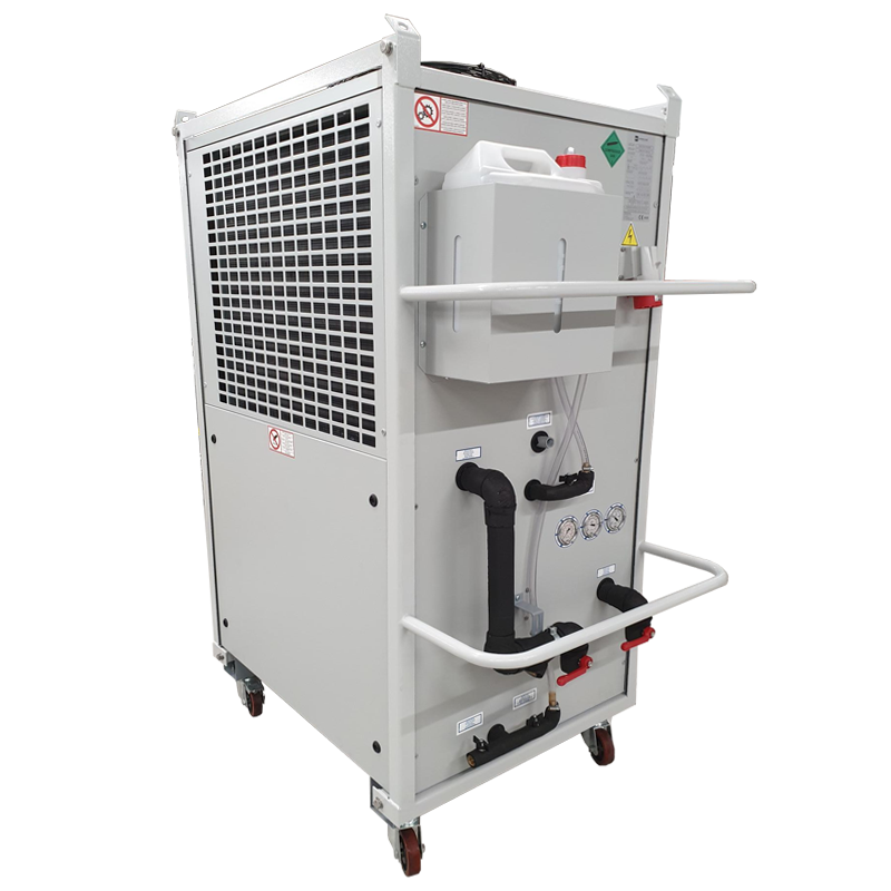 Le 15 kW est un groupe froid compact et puissant, qui peut être utilisé dans une multitude d’applications. Il suffit de le connecter aux systèmes de refroidissement fixes des clients pour obtenir immédiatement de larges volumes d’eau glacée jusqu’à 0°C. Les roues facilitent le déploiement et le déplacement rapide en cas de besoin. Lorsqu’il est utilisé en combinaison avec des ventilo-convecteurs, ce groupe froid offre une climatisation à haute capacité. Le 15 kW fait partie d’une gamme d’équipements qui peut satisfaire tous les besoins de refroidissement et contrôle de la température. Il s’adapte parfaitement aux exigences commerciales et industrielles des clients.